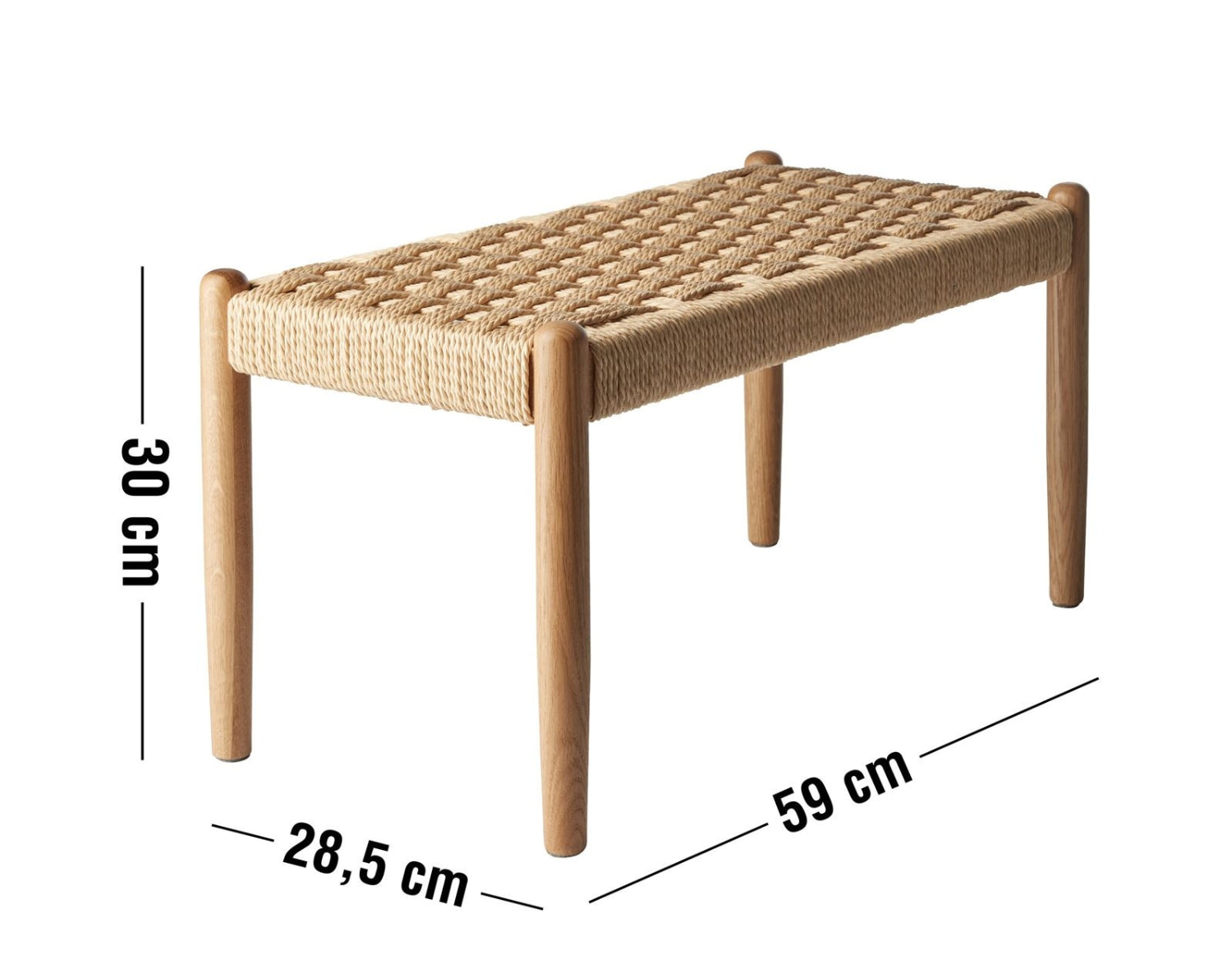Denne smukke børnebænk i massiv eg med sæde i flettet papirsnor kombinerer nordisk enkelthed med varme, naturlige materialer. Det flettede sæde giver bænken et let og tidløst udtryk, der passer perfekt ind i det æstetiske børneværelse. Brug den også som siddeplads i entréen, ved en lille legeplads eller som dekorativ opbevaring ved fodenden af sengen.