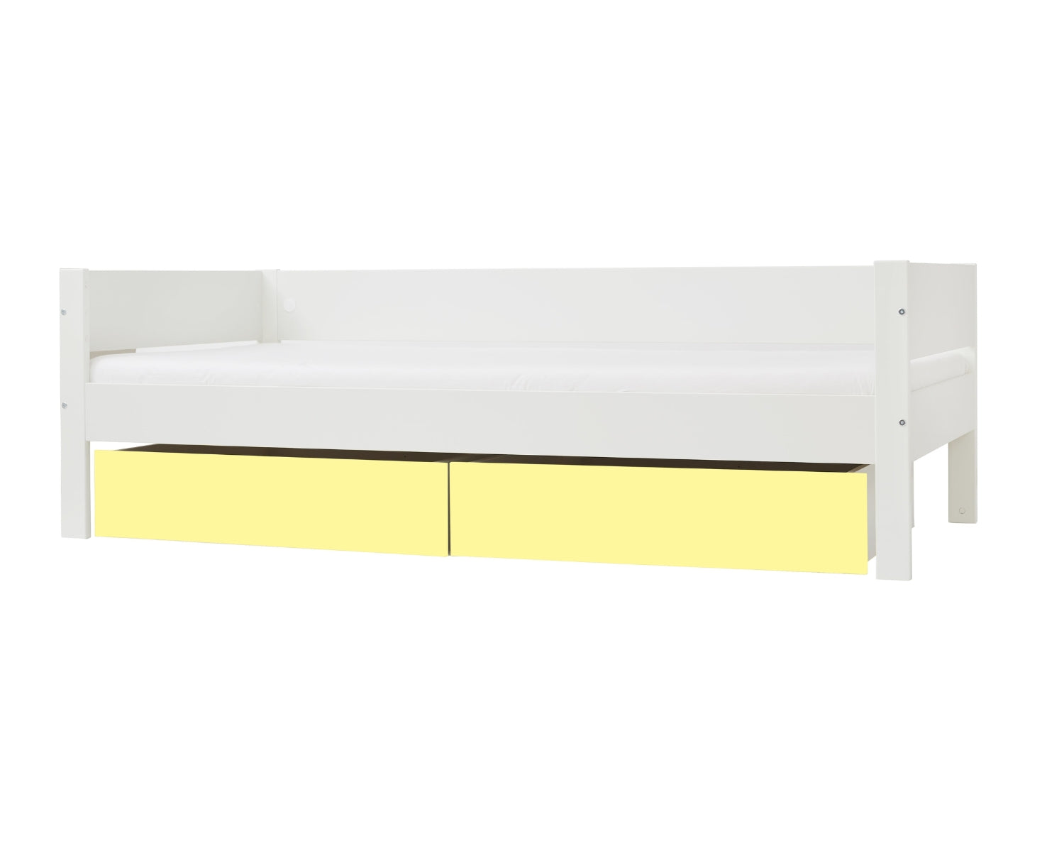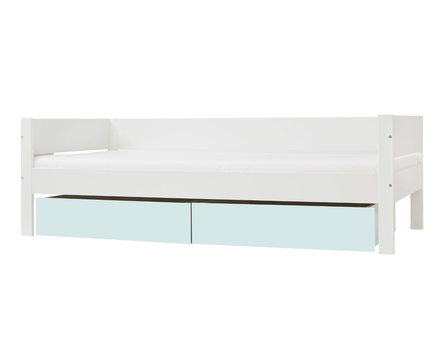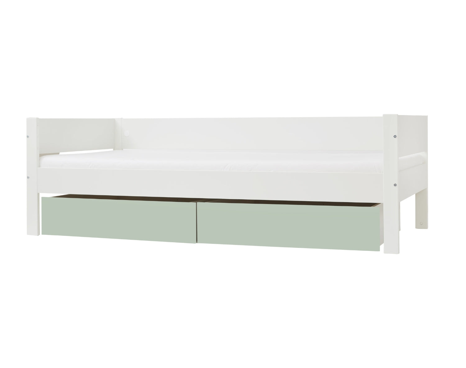 Standardfarven er klassisk hvid, men du kan sætte dit eget præg med detaljer som skuffer eller sengehest i bløde farvetoner som Azur Mint, Dusty Rose, Sunny Yellow eller Light Green – perfekte til at skabe en rolig og personlig atmosfære på børneværelset.
