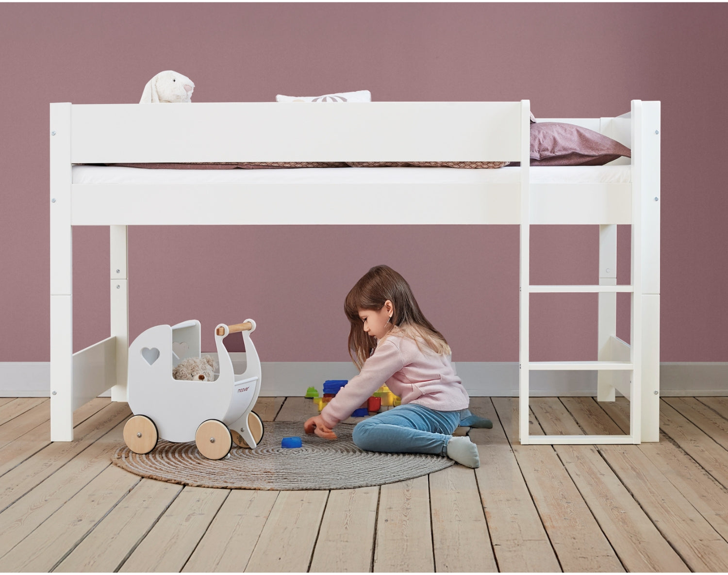 Med denne seng har du en pladsbesparende løsning. Her er god plads til leg og samtidig en sikker og hyggelige seng. Du kan starte simpelt ud samtidig med, at du har mulighed for at ændre efter behov. Systemet er enkelt, så det er nemt for alle at ombygge sengen til for eksempel en køjeseng eller en briks på gulvet.