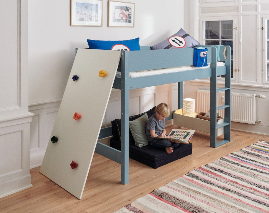 Klatrevæggen passer til halvhøje, mellemhøje og køjesenge og kan nemt monteres på fronten eller i enden af sengen.