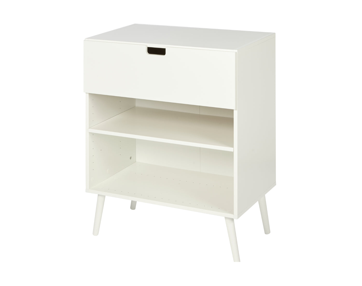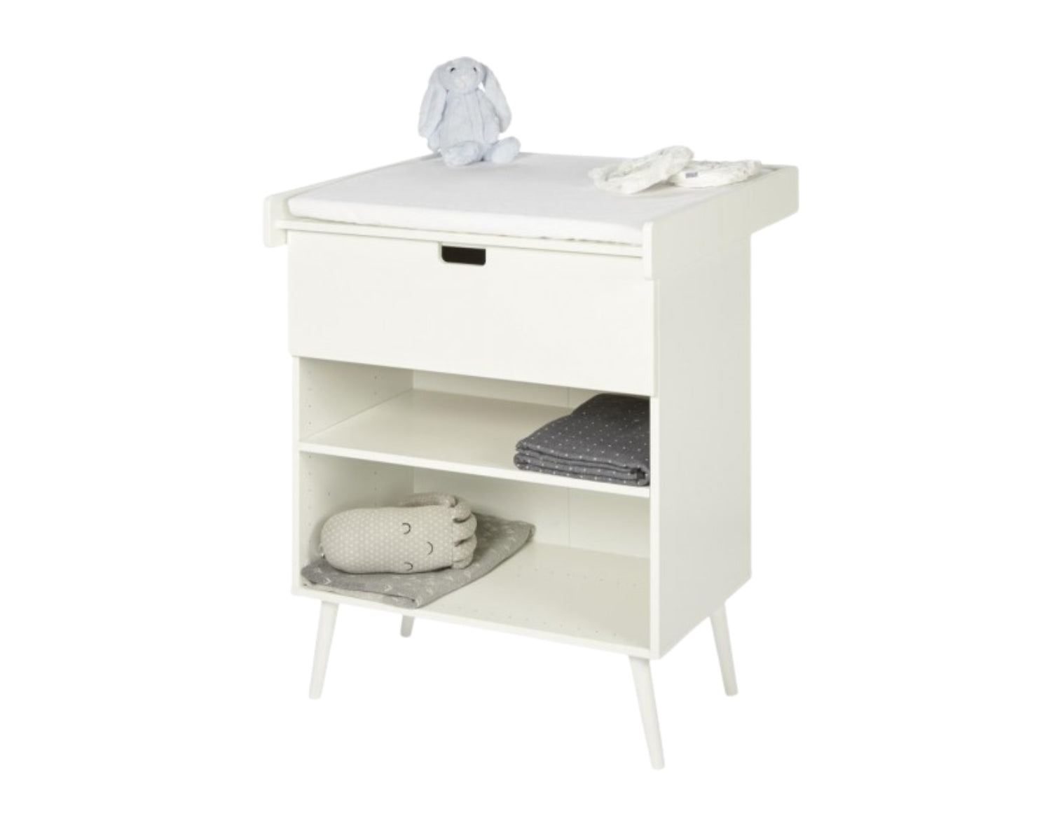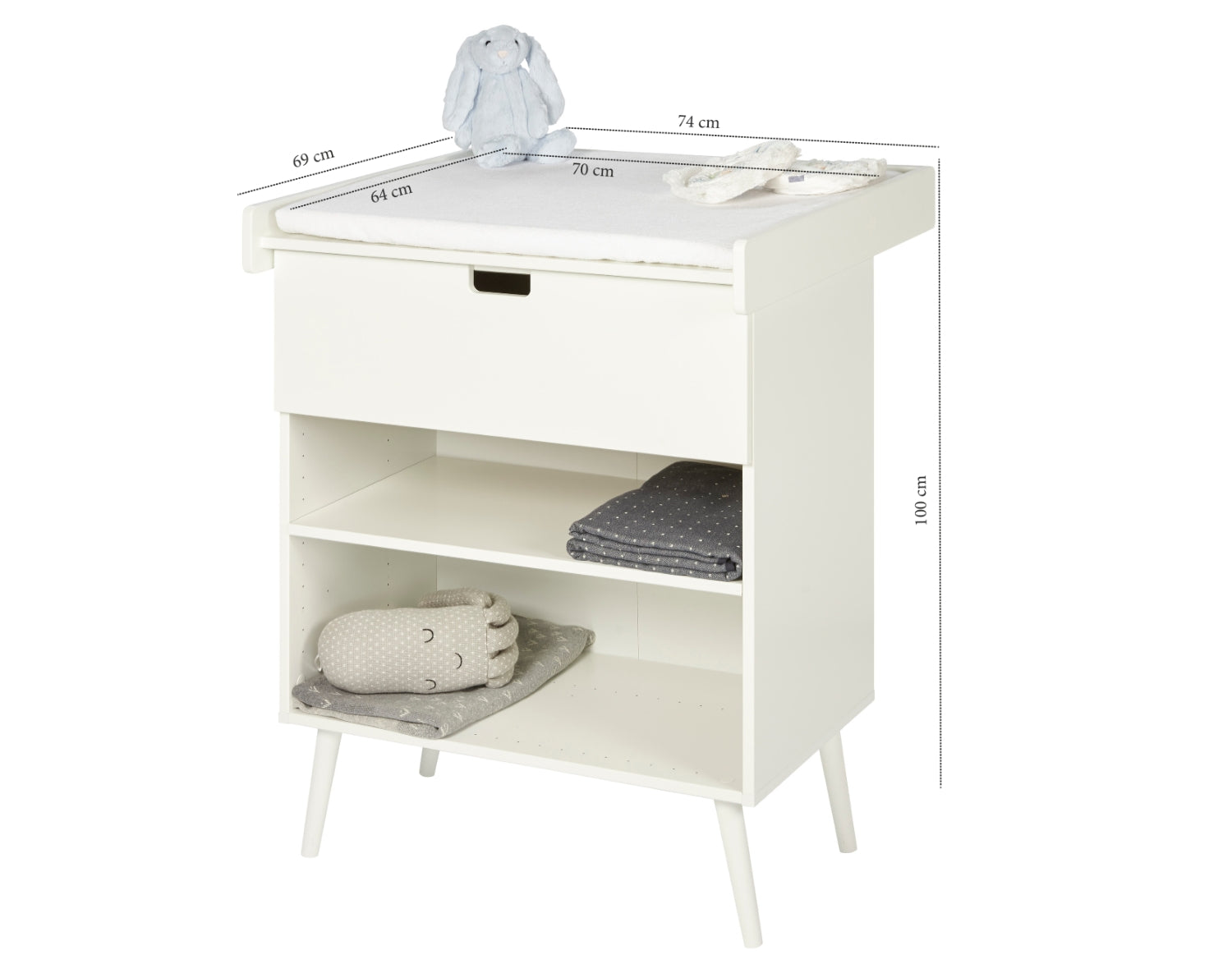 Kommoden har en rummelig, dyb skuffe med massive træsider og en praktisk hylde nedenunder. Her er der god plads til bleer, stofbleer, cremer og alt det, du gerne vil have lige ved hånden, når du pusler. De høje ben giver luft og lethed i udtrykket – og gør det nemt for dig at komme helt tæt på bordet, uden at skulle læne dig uhensigtsmæssigt ind over.