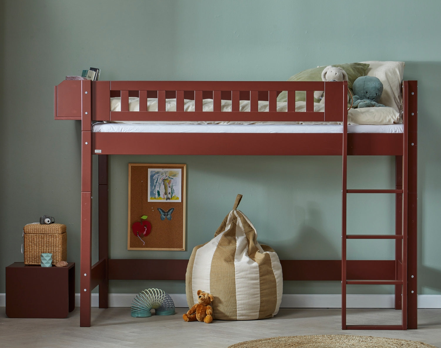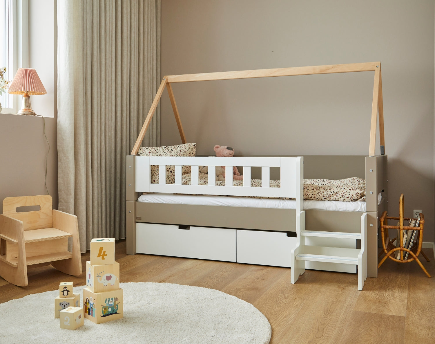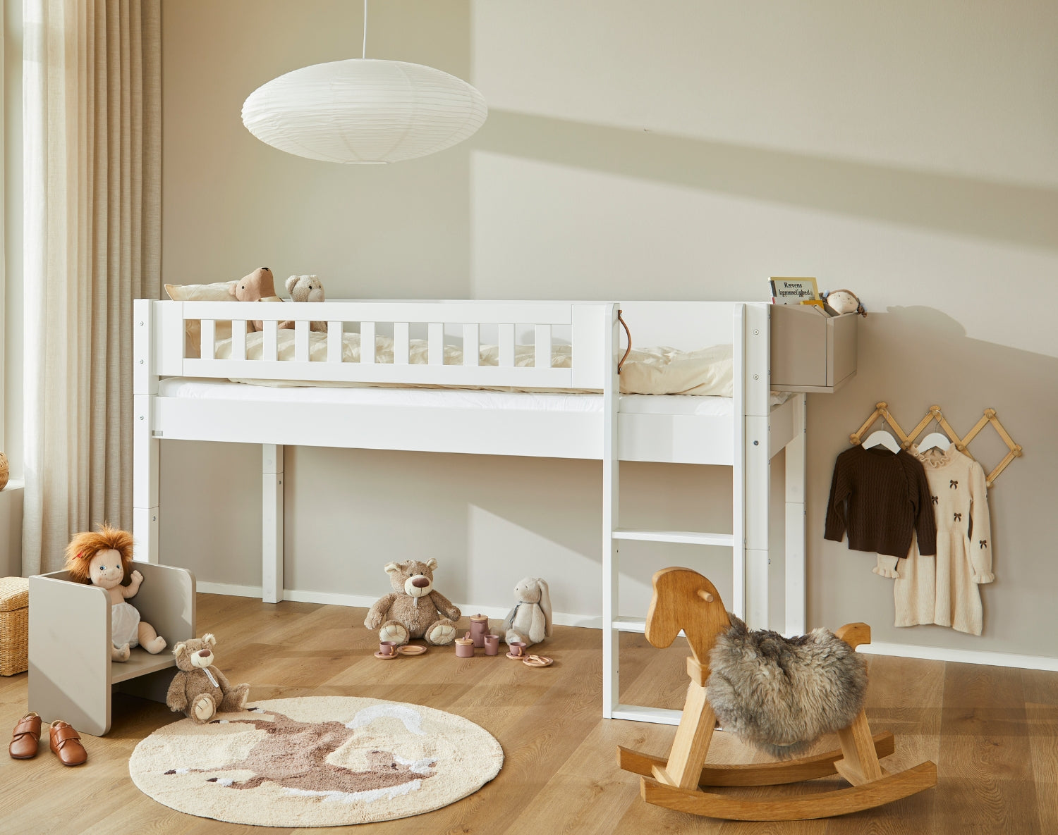 Tremmerne giver sengen et let og harmonisk udtryk, og tilfører samtidig en smuk detalje, der passer naturligt ind i et stilrent børneværelse.