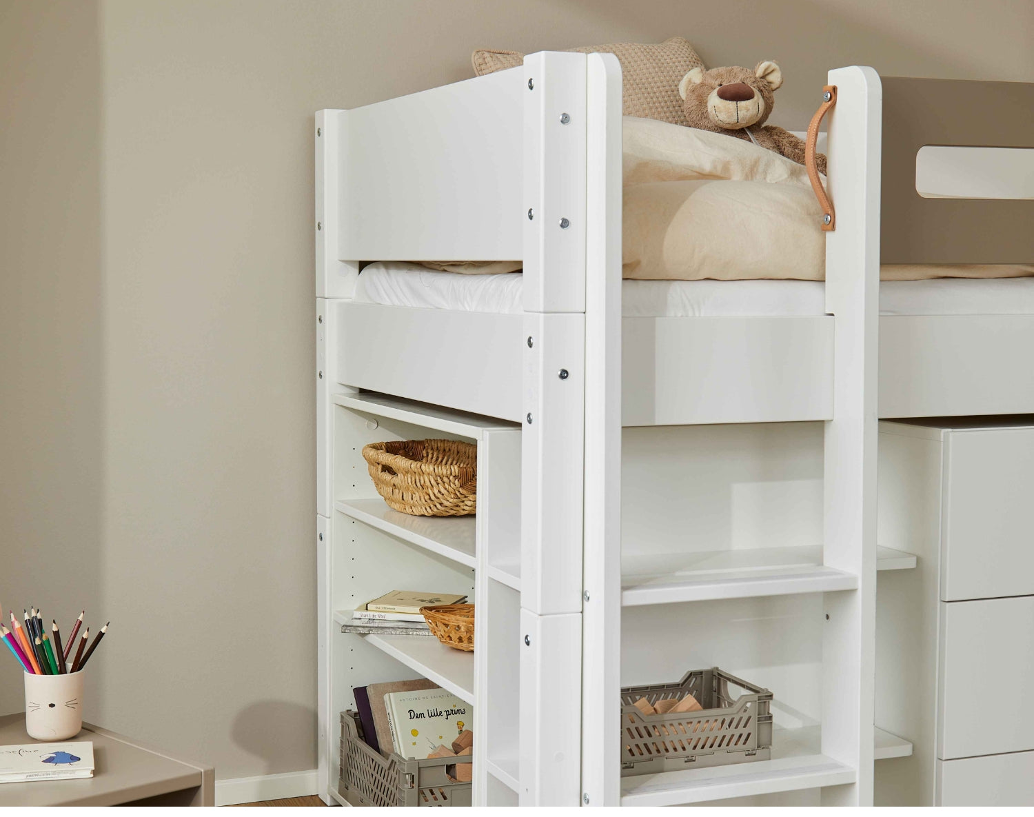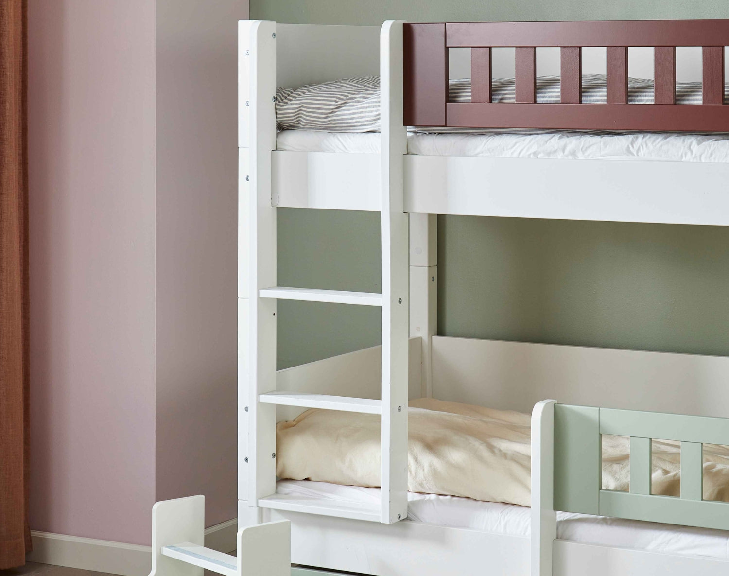 Med denne alsidige stige kan du nemt udbygge en halvhøjseng til en pladsbesparende køjeseng, når to børn skal sove i samme værelse. Du behøver ikke købe en ny stige – den samme model passer perfekt til begge sengeløsninger. Det gør overgangen både nem, økonomisk og bæredygtig.