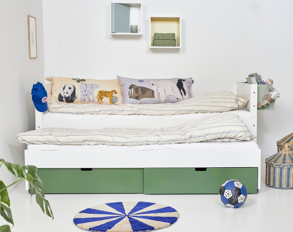 Die geräumigen Schubladen unter dem Bett bieten guten Stauraum für Spielsachen, Bettwäsche oder Bücher und sorgen für Ruhe und Ordnung im Zimmer.
