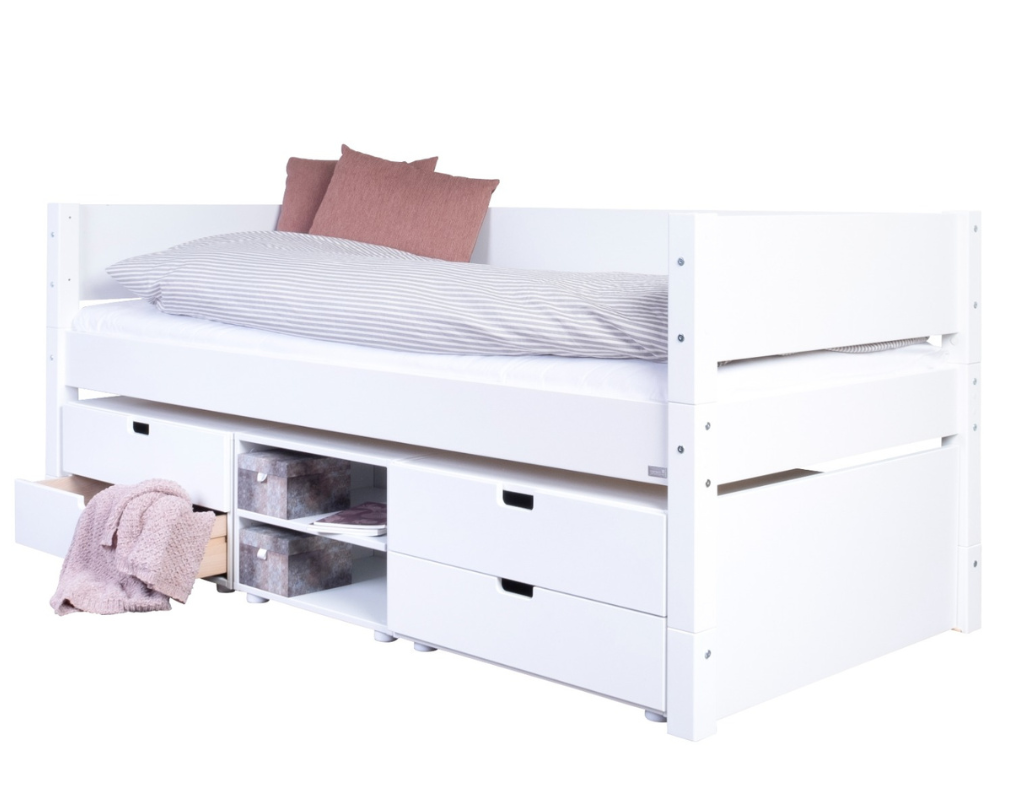 Das Bücherregal und die Kommode können später freistehend verwendet werden, sodass Sie auch dann noch Freude daran haben – selbst wenn das Bett später einmal umgebaut oder ausgetauscht wird. Dank der Rückenlehne eignet sich das Bett tagsüber perfekt als kleines Sofa. Mit einem Bettgitter an der Vorderseite (separat erhältlich) schaffen Sie zusätzliche Sicherheit, insbesondere für kleinere Kinder. Denken Sie daran, für eine korrekte Montage einen Kinnriemen anzubringen.
