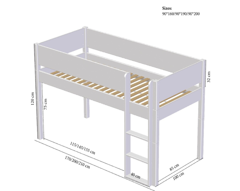 Arn mid-height bed with plenty of storage space. The perfect bed combination for smaller spaces where practical solutions are needed. The bed combination comes with two chests of drawers, which can later be used separately in the room when the child no longer wants a mid-height bed.