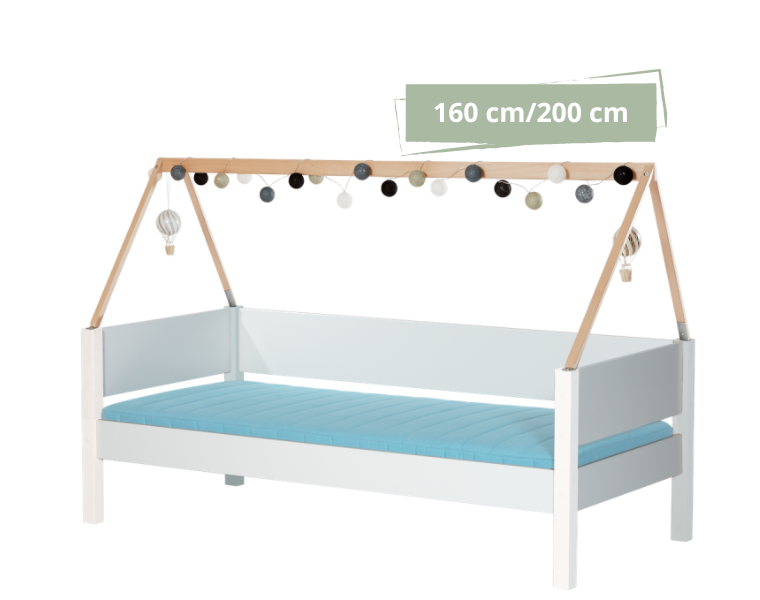 Saga is a children's bed designed with our beech bed frame. You can either add decorations such as fairy lights or our cotton canopy to the bed frame, so your child has a nice den where they can hide and play.