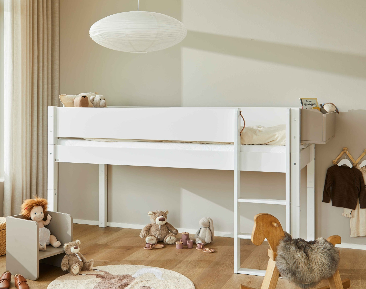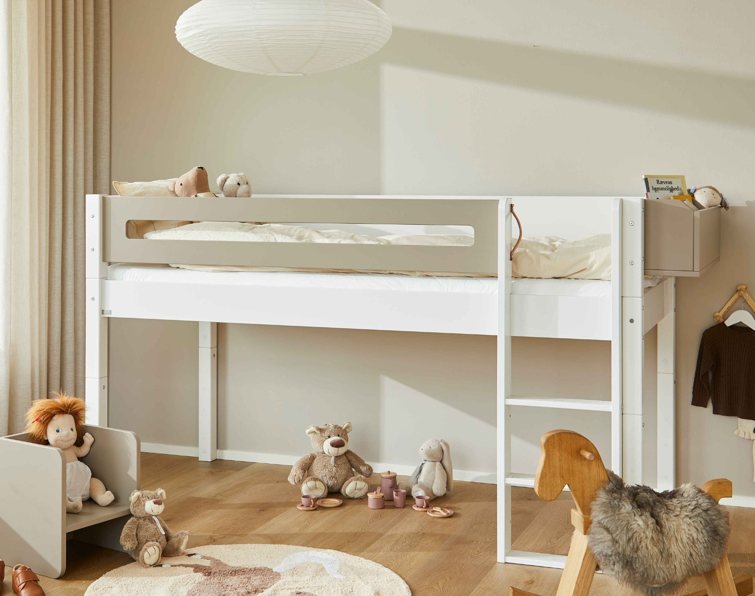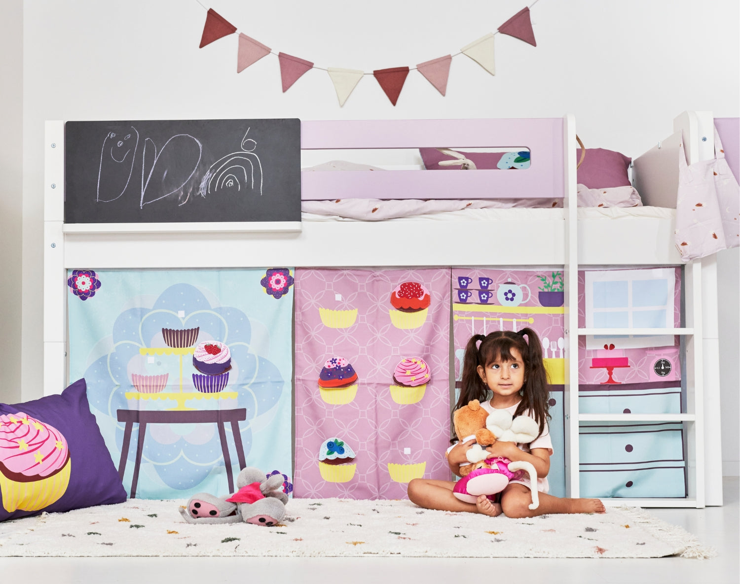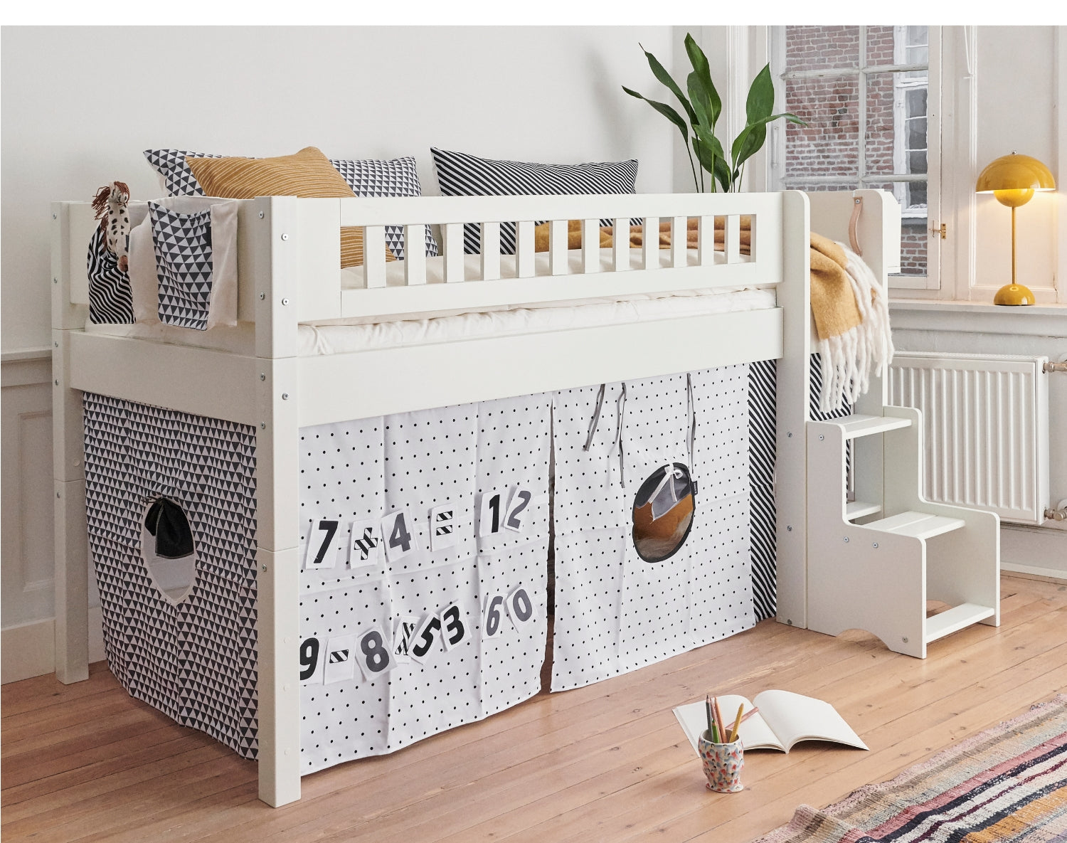 Frej er den perfekte halvhøje børneseng, hvor funktion og fantasi smelter sammen i en tryg og inspirerende ramme. Her kan dit barn sove roligt og sikkert om natten – omgivet af høje, beskyttende sengeheste i et design, du selv vælger – og vågne op til et helt univers af leg og hygge under sengen.