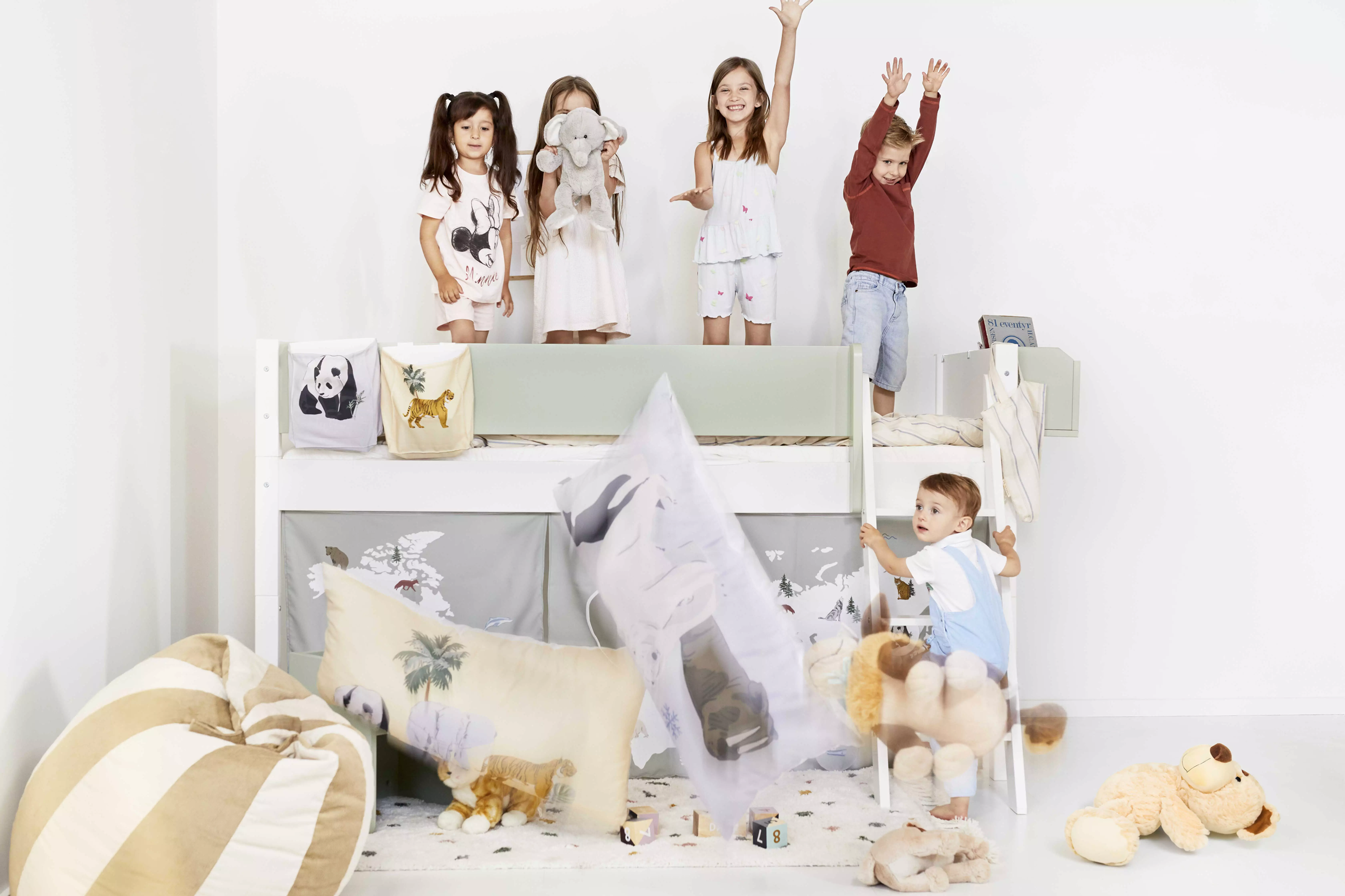 Hos os er en seng ikke bare en seng – den kan nemlig bygges længere, højere og i flere etager, efterhånden som behovet ændrer sig. Og du kan personliggøre den med et væld af tilbehør fra opbevaring og udtræksseng til rutsjebane, klatrevæg, hustag, bogkasser, reoler og meget mere.