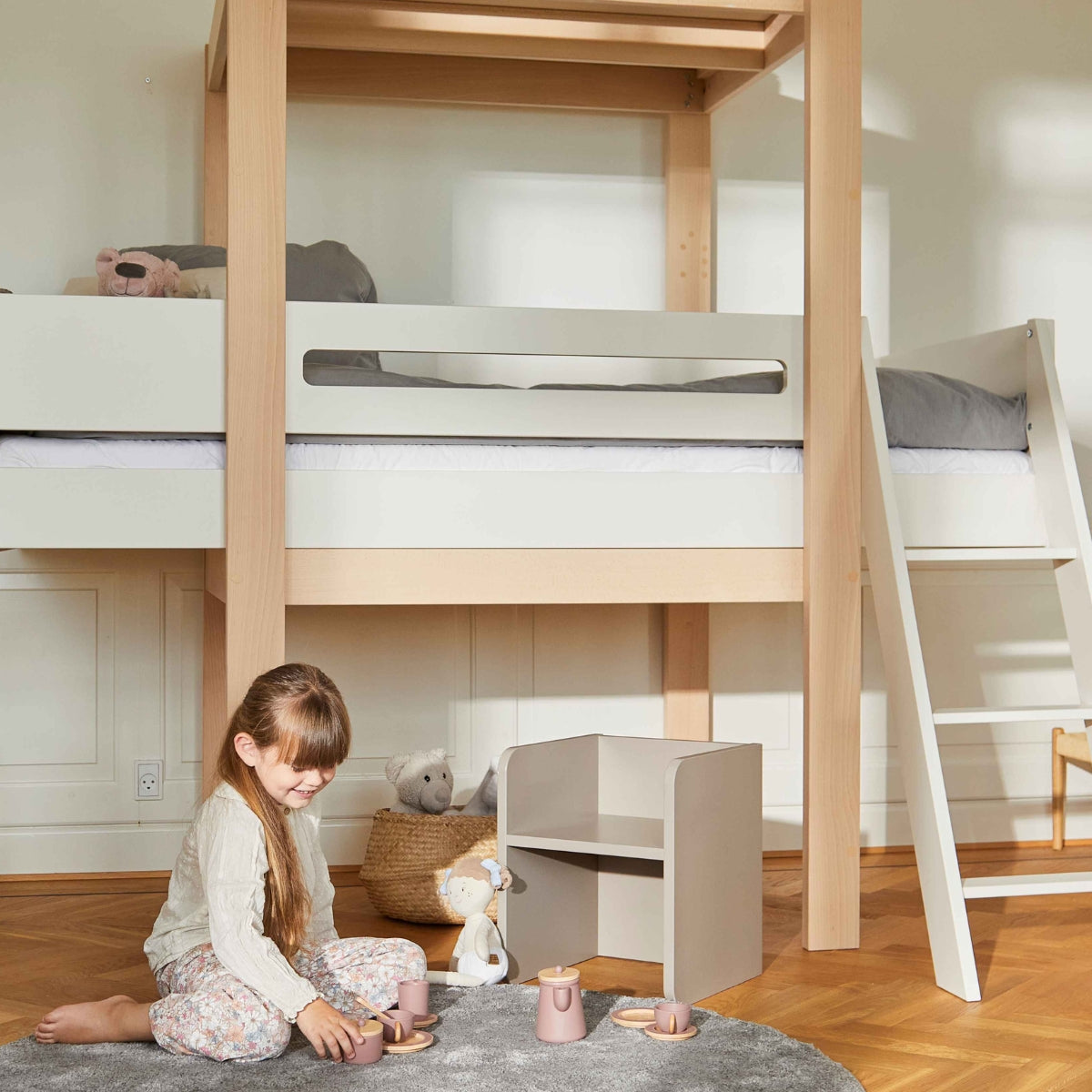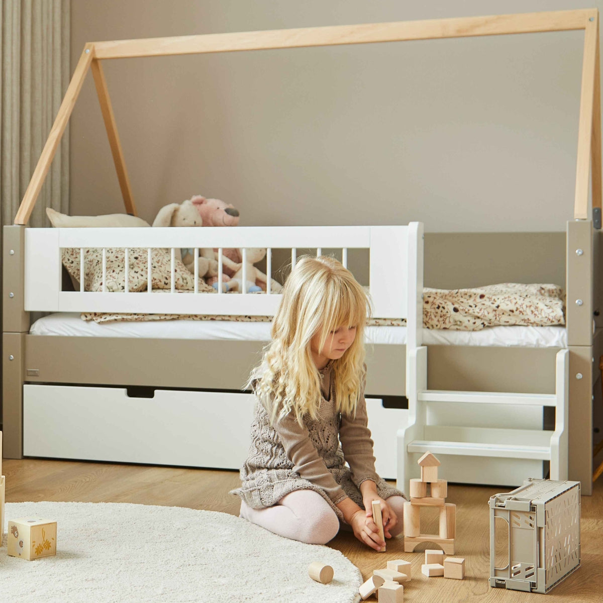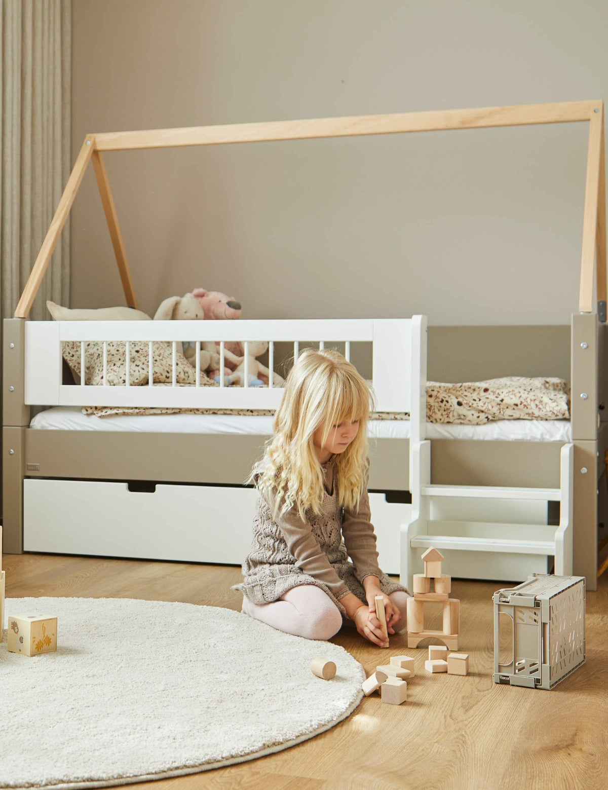 Med vores fleksible byggesystem kan sengen vokse med barnet – fra briks til juniorseng, halvhøj, køje eller højseng, og tilbage igen. Ét system, mange muligheder.