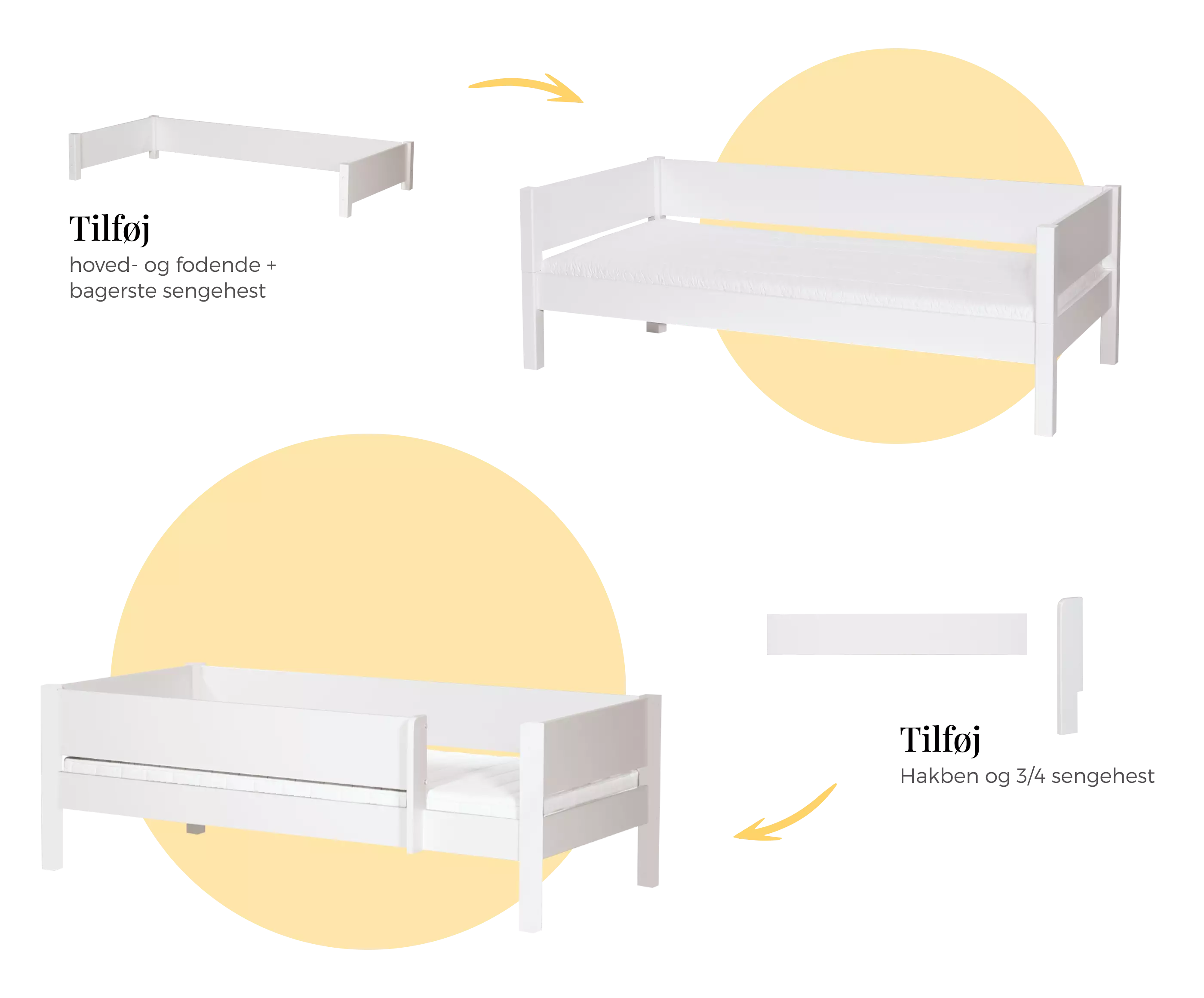 Vi har udviklet et simpelt byggesystem som nemt og enkelt kan udbygges og ombygges. En briks er udgangspunktet, og denne kan om- og udbygges i en uendelighed. Sengehest og gavle kan vælges med forskellige designs eller med helt specielle og unikke prints, som giver værelset individualitet. Sengetæpper, legegardiner/forhæng, store puder, små puder, sengelommer, madrasser i flotte farver og designs, som kan matches efter ønske, behov og alder, eller blot som moden skifter.