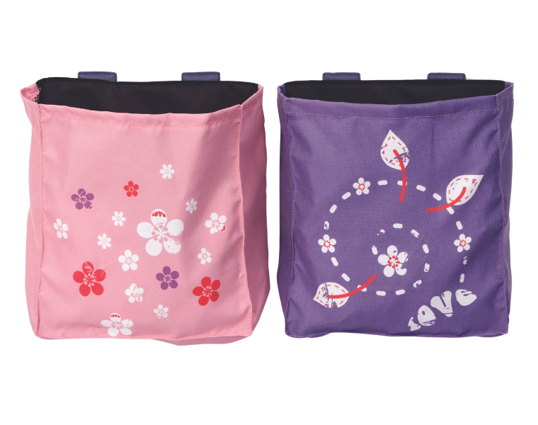 Rosa & lilla sengelommer med sødt blomster/"Love" tryk. Sengelommerne monteres simpelt med stropper med velcro - passer både på sengeside, sengegavl eller sengehest. Sengelommer bør renses.