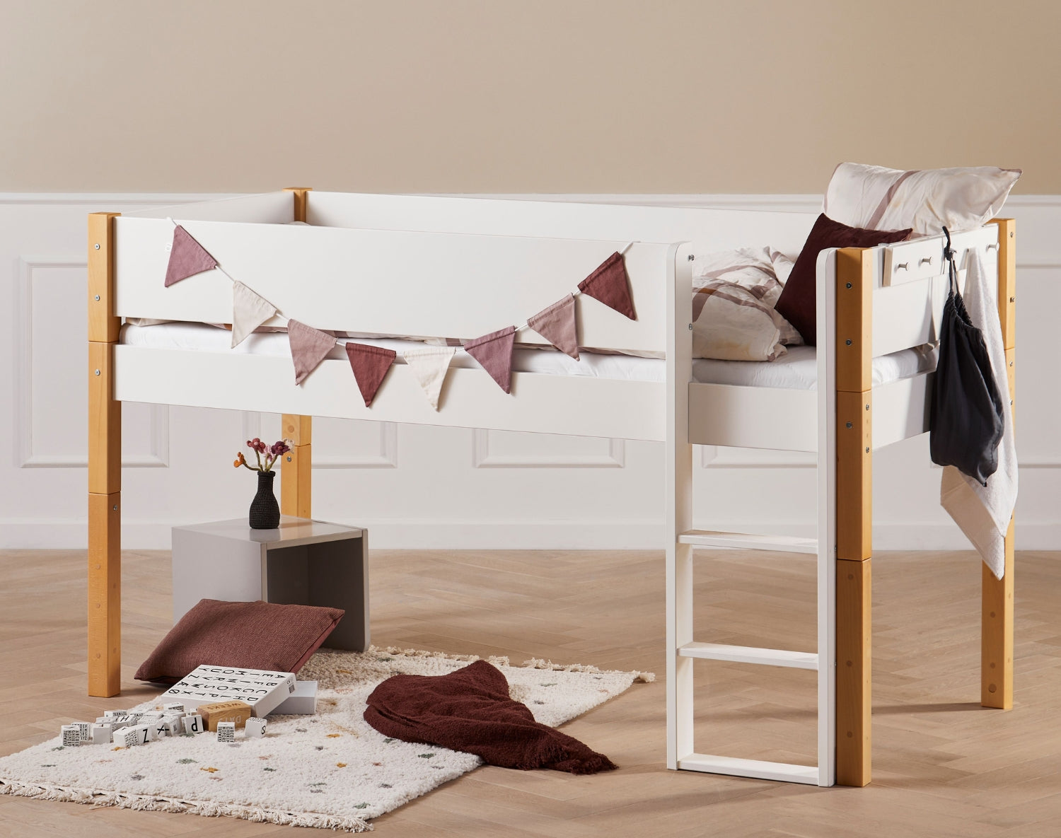 Underkanten af sengen skaber nemlig en oplagt ramme for hulebyggeri, opbevaring eller bare en lille hyggelig krog. Her kan der indrettes med tæpper, puder og eventyr – og hvis I ønsker endnu mere leg, kan Frej kombineres med en rutsjebane som i vores populære Loke-kombination.