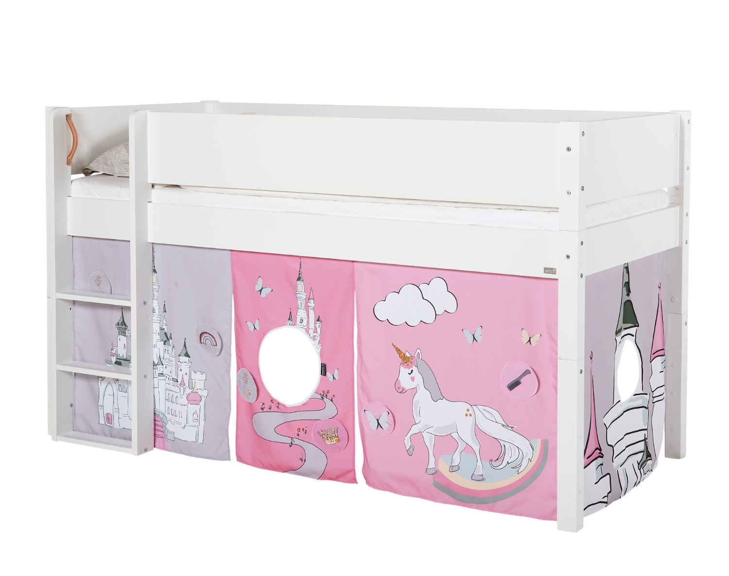 Passer til vores halvhøje- og køjesenge i 160 cm eller 200 cm, så du nemt kan skabe en tryg, sjov og fantasifuld plads, der passer perfekt til dit barns værelse. Lad enhjørningen og dens magiske univers blive en del af hverdagen og bringe smil, glæde og eventyr til hvert eneste øjeblik under sengen!