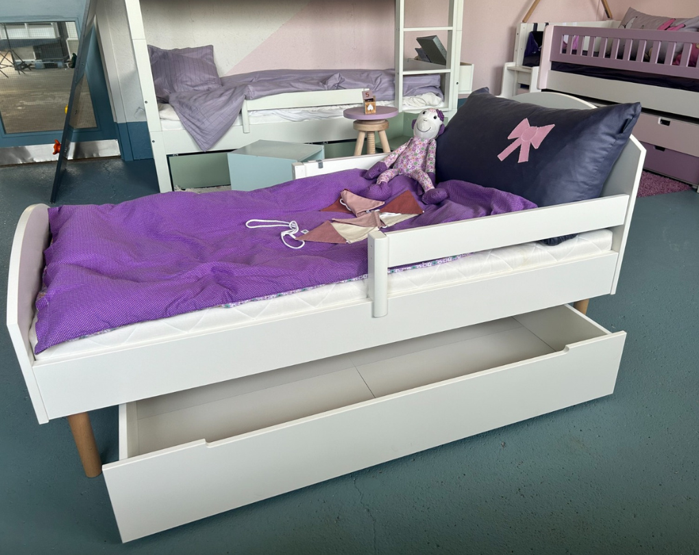 Passer til Retro Junior, men kan også bruges under vores junior Huxie-senge. Skuffen er dog lidt kortere for at kunne passe under Retro sengen, så der er lidt plads mellem benene og skufferne, når den bruges under Huxie.